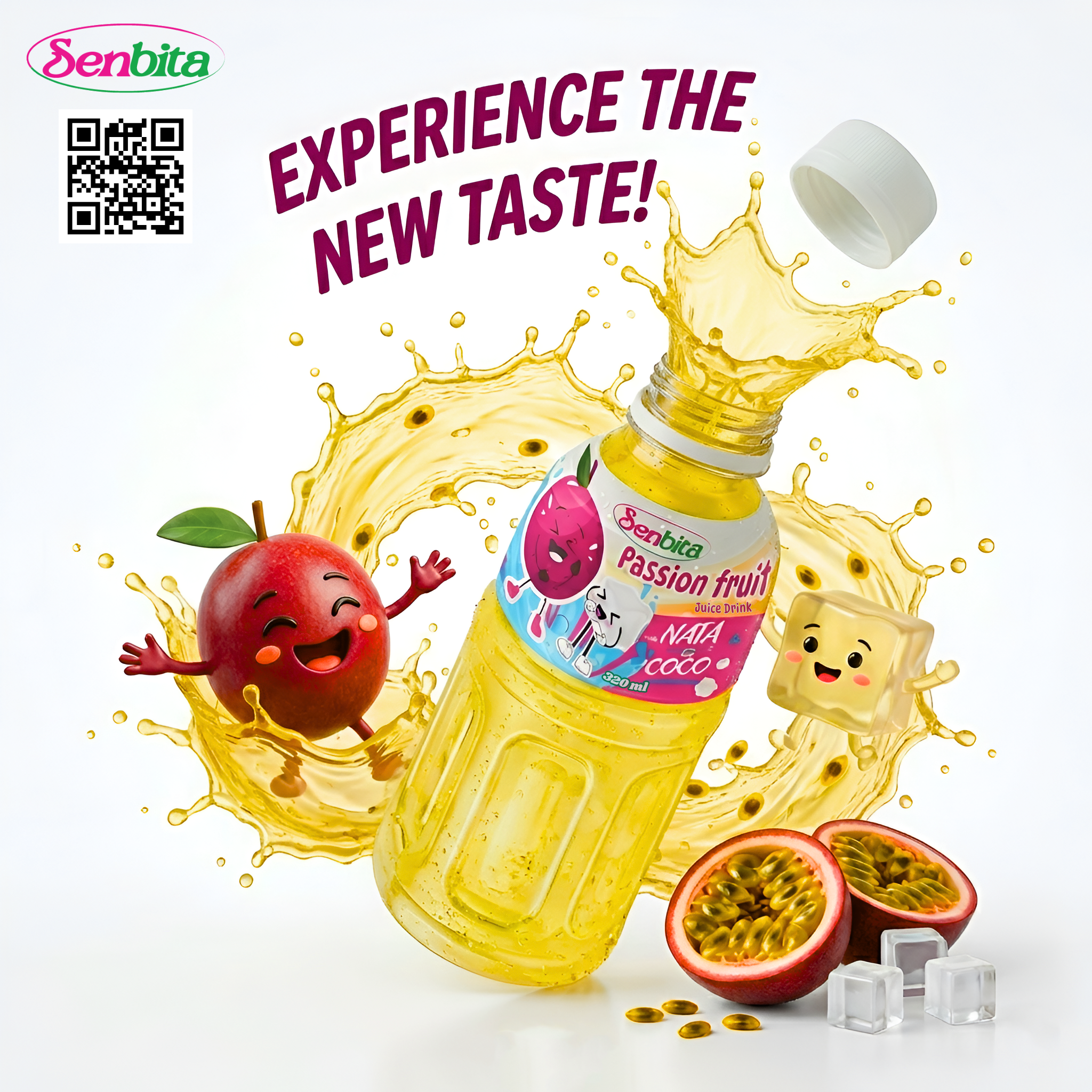 SENBITA Passion Fruit Juice Drink with Nata de Coco contains soft nata de coco cubes made from fermented coconut water. These chewy cubes create a fun and engaging drinking experience, which is increasingly popular among global consumers.